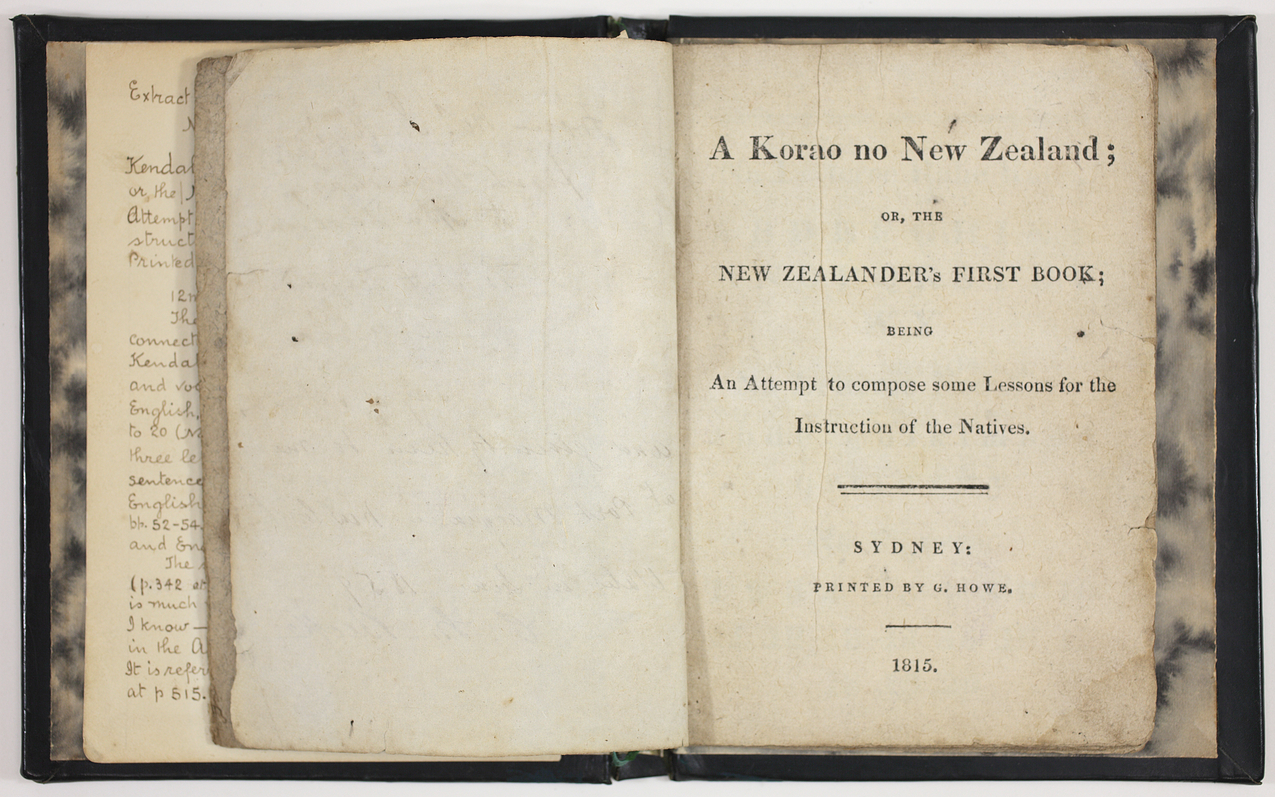 A korao no New Zealand; or, the New Zealander's first book was written by Anglican missionary Thomas Kendall in 1815, and is the first book written in the Māori language. The full title is A korao no New Zealand, or, The New Zealander's first book :
