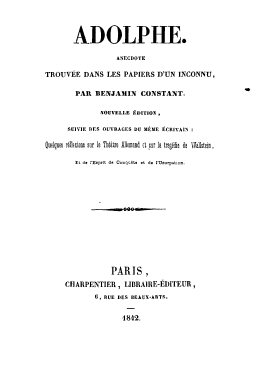 Description Adolphe is a classic French novel by Benjamin Constant, first published in 1816. It tells the story of an alienated young man, Adolphe, who falls in love with an older woman, Ellénore, the Polish mistress of the Comte de P***. Their illicit relationship serves to isolate them from their friends and from society at large. The book eschews all conventional descriptions of exteriors for the sake of detailed accounts of feelings and states of mind.Constant began the novel on 30 October 1806, and completed it some time before 1810.D. Milačić, „Beleška o piscu“, in B. Konstan, Adolf - Sesila. Beograd: Rad, 1964, pp. 143-148. While still working on it he read drafts to individual acquaintances and to small audiences, and after its first publication in London and Paris in June 1816 it went through three further editions: in July 1816 (new preface), July 1824 in Paris (restorations to Ch. 8, third preface), and in 1828. Many variants appear, mostly alterations to Constant's somewhat archaic spelling and punctuation.