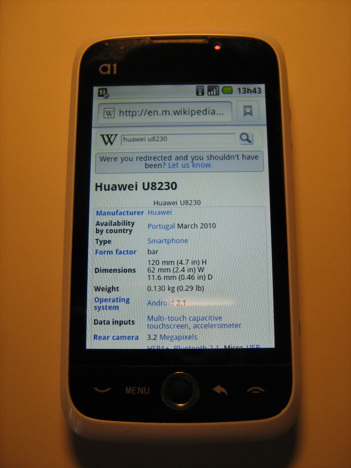 Description The Huawei U8230 is a touchscreen mobile phone running Android, and which targets the mid-end phone market. The phone is distributed in Portugal by TMN as TMN A1.