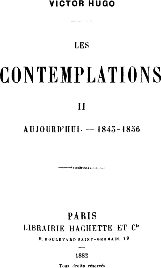 Les Contemplations (The Contemplations) is a collection of poetry by Victor Hugo, published in 1856. It consists of 156 poems in six books. Most of the poems were written between 1841 and 1855, though the oldest date from 1830. Memory plays an