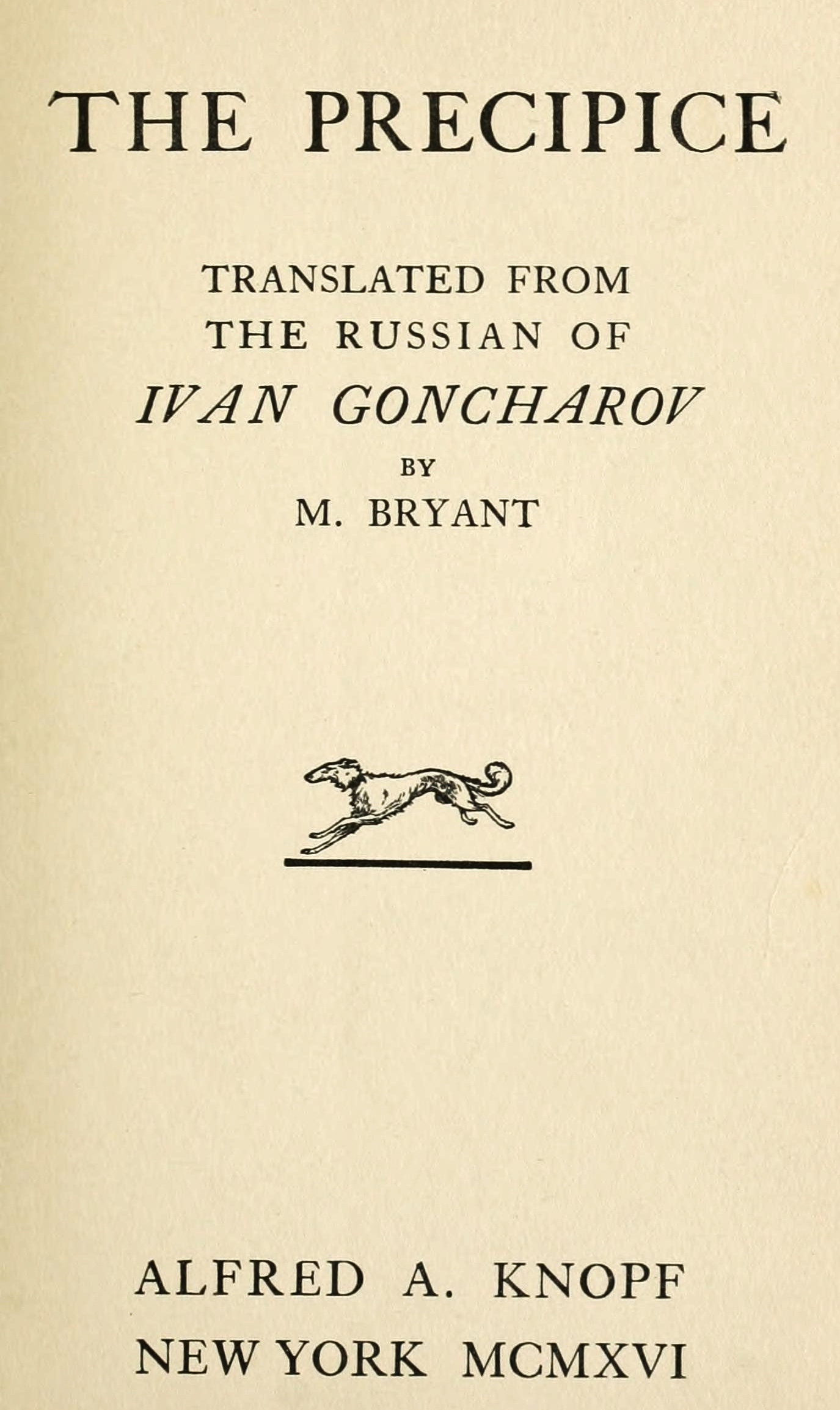 The Precipice (Обрыв) is the third novel by Ivan Goncharov, first published in January–May 1869 issues of Vestnik Evropy magazine.The Works by I.A.Goncharov in 6 volumes. Ogonyok Library. Pravda Publishers. Moscow, 1972. Vol.VI. Commentaries,