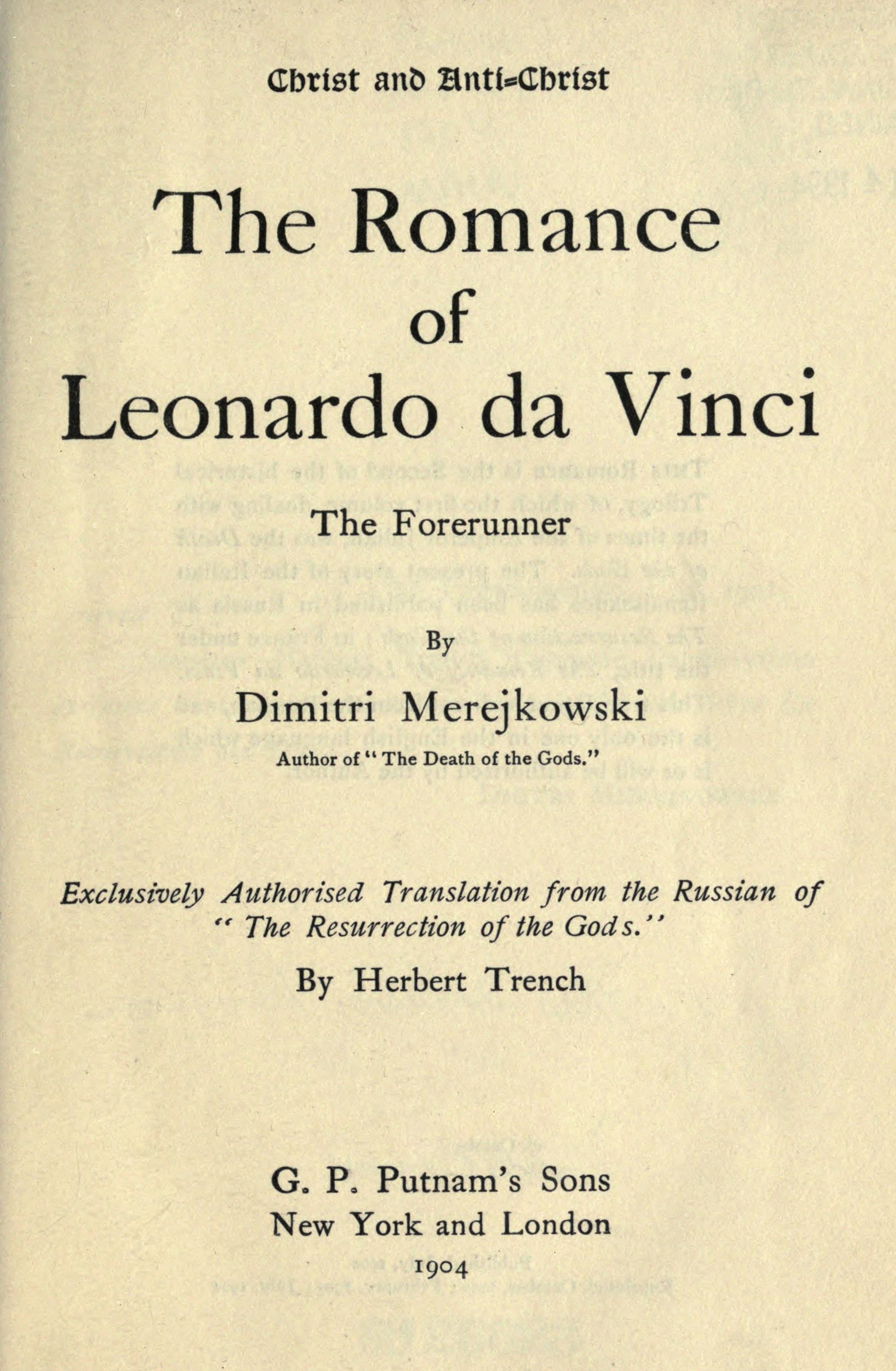 The Romance of Leonardo da Vinci (, Resurrected Gods. Leonardo da Vinci, in literal translation) is the second novel by Dmitry Merezhkovsky, first published in 1900 by Mir Bozhy magazine, then released as a separate edition 1901. The novel